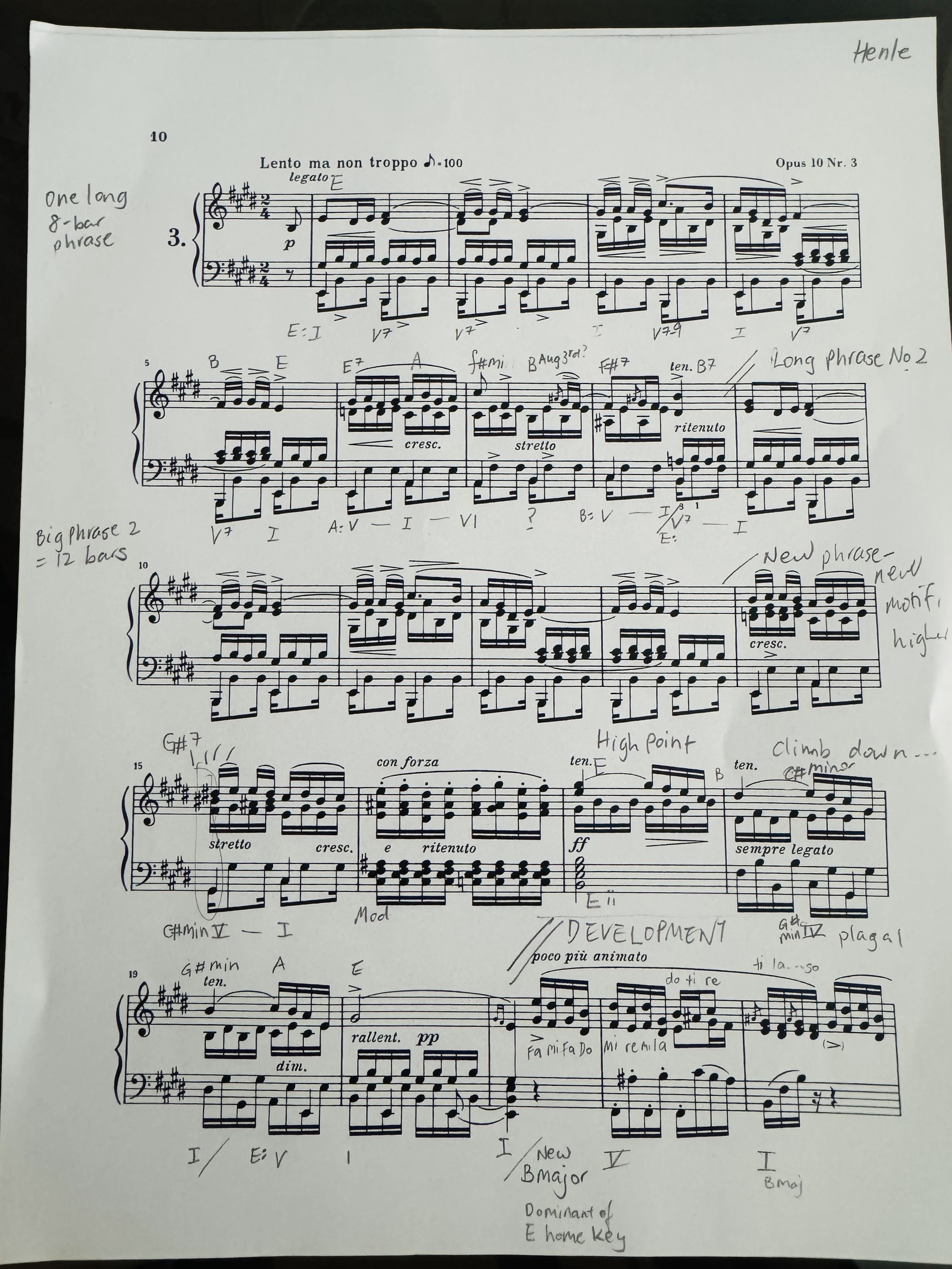 Score analysis pics are attached, the first two pages. The piece is essentially in A-B-A format. The exposition and recap essentially alternate a lot between V and I chords, B major and E major. Chopin constructs pretty long phrases — usually 8 or 12 bars, with 4 bar sub-phrases within that.