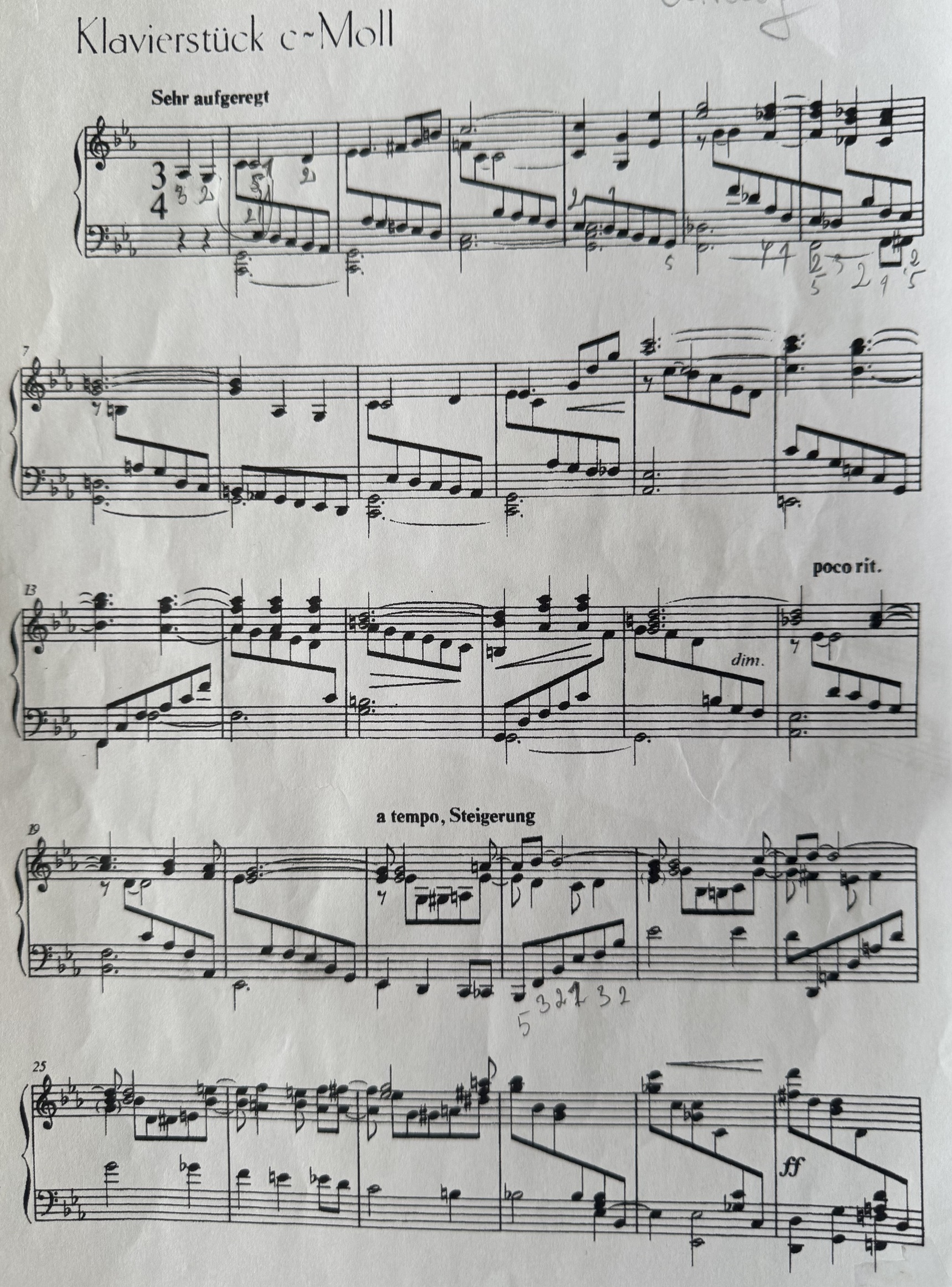 In Alban Berg’s Klavierstück in c-minor I’m struggling with fingering. A part of me feels that the middle downward passages could be divided between both hands, if so, where should the respective other hand best step in? I have relatively large hands and could reach those distances, but I have no way to appreciate how that would be in full tempo. Or is it all left hand?