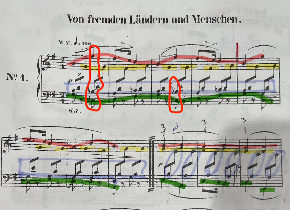 For the romantic challenge, I'm working on Schumann's Von fremden ländern und menschen. I've attached a short clip of my playing and also the marked up music related to qs. 3. Would love your advice on these: