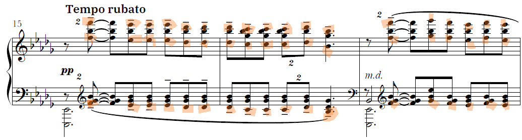 Voicing and tone: I am aiming for a smooth, ‘non-growly’ tone that emphasises the melodic LH line (and, where appropriate, when it transfers to the RH).