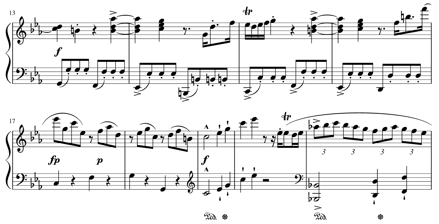 I would really welcome any advice on measures 13-18 in the first movement of Mozart's C minor sonata particularly with respect to fingering in the left hand (I have experimented with 5111, 5121, 5131, leaning towards the latter) and the dotted rhythmns in the right hand. The piece is all but within striking distance for me, other than for this passage!