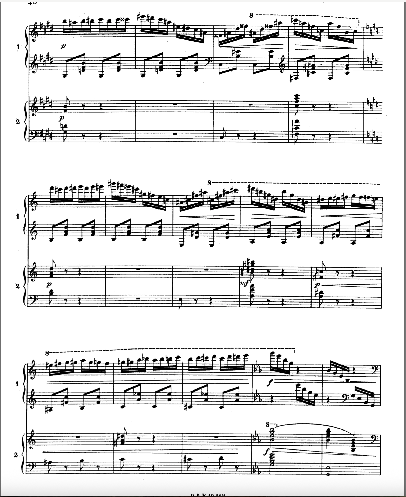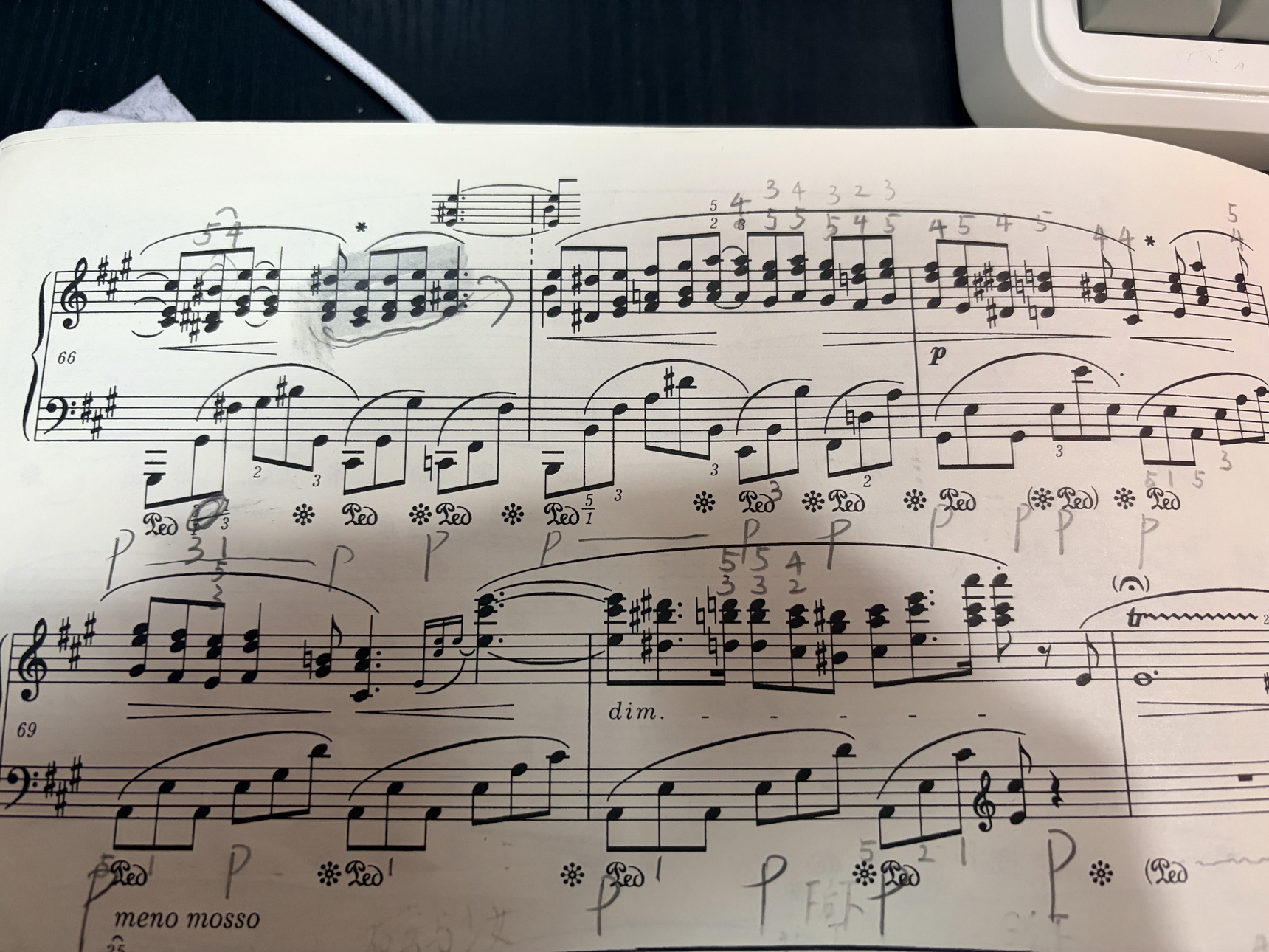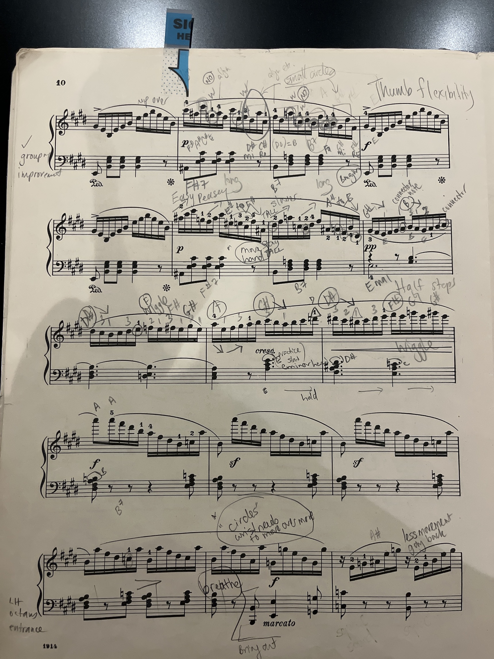 In the Mendelssohn Rondo Capriccioso, I struggle with these passages makes with the blue sticky. The ends of the runs tend to get cramped up together. And the second run with A# C# E G, is awkward shifts of the hand.